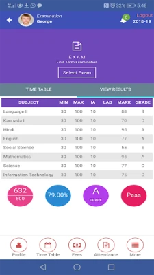 Examination: Teachers can create exam Time Table and enter marks to subject while parents and students can view them.